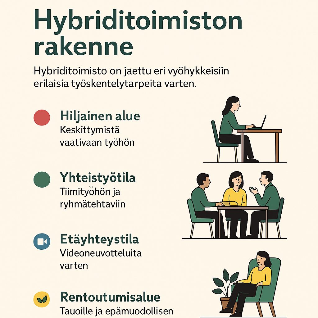 Alla oleva kaavio havainnollistaa, miten moderni hybriditoimisto rakentuu eri vyöhykkeistä: hiljaisista työalueista, yhteistyötiloista, etäyhteystiloista ja rentoutumisalueista.